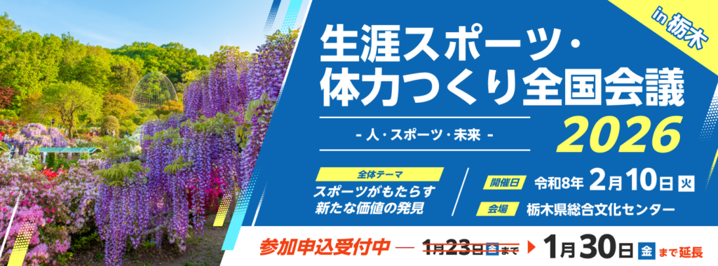『生涯スポーツ・体力つくり全国会議 2026』参加申込期間を1月30日(金)まで延長しました 2026年1月20日 最終更新日時 : 2026年1月20日 nraj_ad 『生涯スポーツ・体力つくり全国会議 2026』の参加申込期間を1月30日(金)まで延長しました。 開催:令和8年2月10日(火)会場:栃木県総合文化センター主催:スポーツ庁、生涯スポーツ・体力つくり全国会議実行委員会 全体テーマ『 スポーツがもたらす新たな価値の発見 』 詳細はこちらをご覧ください 生涯スポーツ・体力つくり全国会議2026