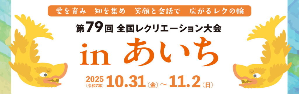 第79回 全国レクリエーション大会inあいち 開催にご協力をいただき、ありがとうございました。 参加申込み受付中!(申込締切:10月15日) |参加費・申込に関するご案内|WEB申込|ご質問・お問い合わせ| |参加費・申 … 続きを読む 全国レクリエーション大会(第79回 愛知県開催)